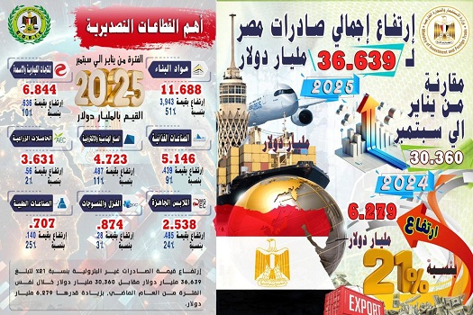 وأوضح التقرير، ارتفاع قيمة الصادرات غير البترولية بنسبة 21% لتبلغ 36 مليار و639 مليون دولار، مقابل 30 مليار و360 مليون دولار خلال نفس الفترة من العام الماضي، بزيادة قدرها 6 مليار و279 مليون دولار. ـ العجز في الميزان التجاري يتراجع 18% إلى 22.7 مليار دولار : كما انخفض العجز في الميزان التجاري بنسبة 18% حيث بلغ 22 مليار و772 مليون دولار مقارنة بـ 27 مليار و 877 مليون دولار خلال نفس الفترة في العام الماضي 2024 ، بقيمة انخفاض قدرها 5 مليار و 105 مليون دولار . وتستهدف الوزارة خلال المرحلة المقبلة زيادة الصادرات غير البترولية لكافة الأسواق الخارجية من خلال سياسة تجارية ترتكز على تعزيز التنافسية وزيادة القيمة المضافة للصادرات مع التركيز على فتح أسواق جديدة وتسهيل الإجراءات التجارية وتعزيز الاستفادة من برنامج رد أعباء التصدير وكذا من اتفاقيات التجارة الحرة المبرمة بين مصر وعدد كبير من الدول والتكتلات الاقتصادية الإقليمية والعالمية، إلى جانب تقليص زمن الافراج الجمركي وربط التجارة بالاستثمار. ـ الإمارات وتركيا والسعودية وإيطاليا والولايات المتحدة تتصدر قائمة الأسواق المستقبلة للصادرات المصرية غير البترولية : وقد تضمنت أكبر الأسواق المستقبلة للصادرات المصرية غير البترولية خلال الفترة من يناير حتى سبتمبر 2025 دولة الإمارات العربية المتحدة بقيمة 5 مليار و938 مليون دولار، مقارنة بنحو 2 مليار و205 ملايين دولار خلال نفس الفترة في العام الماضي 2024 وبنسبة زيادة 169%، تركيا بقيمة 2 مليار و394 مليون دولار، مقارنة بنحو 2 مليار و305 ملايين دولار خلال نفس الفترة من العام الماضي 2024 وبنسبة زيادة 4%، السعودية بقيمة 2 مليار و262 مليون دولار، مقارنة بنحو 2 مليار و558 مليون دولار خلال نفس الفترة من العام الماضي 2024 وبنسبة انخفاض 12%، إيطاليا بقيمة 2 مليار و99 مليون دولار، مقارنة بنحو مليار و630 مليون دولار خلال نفس الفترة من العام الماضي 2024 وبنسبة زيادة 29%، الولايات المتحدة بقيمة 2 مليار و81 مليون دولار، مقارنة بنحو مليار و681 مليون دولار خلال نفس الفترة من العام الماضي 2024 وبنسبة زيادة 24% . ـ ارتفاع قيمة الصادرات المصرية غير البترولية : وقد ارتفعت قيمة الصادرات المصرية غير البترولية لأهم 5 دول مستوردة خلال الفترة من يناير حتى سبتمبر 2025 بنسبة 42 % لتصل إلى 14 مليار و774 مليون دولار، مقارنة بنحو 10 مليار و379 مليون دولار خلال نفس الفترة من العام الماضي وبقيمة 4 مليار و395 مليون دولار. ـ قطاع مواد البناء يتصدر أهم القطاعات التصديرية التي شكلت هيكل الصادرات غير البترولية بقيمة 11.6 مليار دولار : كما تضمنت أهم القطاعات التصديرية التي شكلت هيكل الصادرات المصرية غير البترولية خلال الفترة من يناير حتى سبتمبر 2025 قطاع مواد البناء بقيمة 11 مليار و688 مليون دولار وبنسبة زيادة 51%، قطاع المنتجات الكيماوية والأسمدة بقيمة 6 مليار و 844 مليون دولار وبنسبة زيادة 10%، قطاع الصناعات الغذائية بقيمة 5 مليار و146 مليون دولار بنسبة زيادة 9%، قطاع السلع الهندسية والإلكترونية بقيمة 4 مليار و723 مليون دولار وبنسبة زيادة 11%، قطاع الحاصلات الزراعية بقيمة 3 مليار و631 مليون دولار بنسبة زيادة 2%، قطاع الملابس الجاهزة بقيمة 2 مليار و538 مليون دولار وبنسبة زيادة 24%. وبلغت قيمة قطاع الغزل والمنسوجات 874 مليون دولار وبنسبة زيادة 3%، قطاع الصناعات الطبية بقيمة 707 مليون دولار وبنسبة زيادة 25%، قطاع الطباعة والتغليف والورق والكتب والمصنفات بقيمة 705 ملايين دولار وبنسبة انخفاض 2%، قطاع المفروشات بقيمة 456 مليون دولار وبنسبة زيادة 3%، قطاع الأثاث بقيمة 277 مليون دولار وبنسبة زيادة 11% ، قطاع الجلود والأحذية والمنتجات الجلدية بقيمة 72 مليون دولار وبنسبة انخفاض 5% .