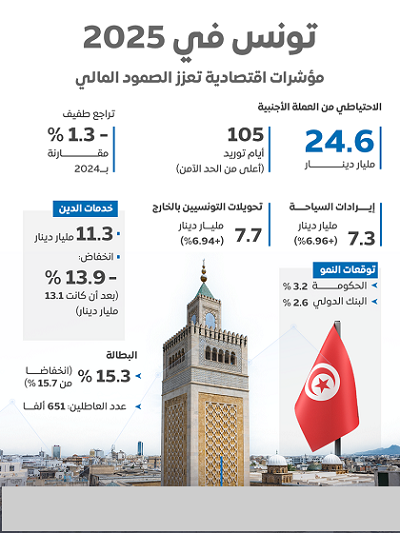 كتب فاطيمة طيبى 7 ديسمبر 2025 2:18 م - التعليقات مؤشرات تعزز صمود تونس المالي بانتعاش الاحتياطي وتحسن النمو في 2025