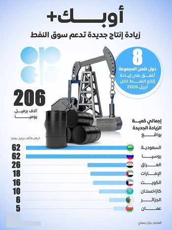 اعداد ـ فاطيمة طيبي اتفقت مجموعة "أوبك+" على زيادة إنتاج النفط بمقدار 206 آلاف برميل يوميا خلال أبريل المقبل 2026 . وقالت أوبك+ في بيان نشر على موقعها الإلكتروني، إن الدول الثماني في المجموعة، اتفقت عقب اجتماعها افتراضيا، الأحد الاول من شهر مارس الحالي ، على تعديل إنتاجي بمقدار 206 آلاف برميل يوميا، وسيتم تنفيذ هذا التعديل في أبريل 2026. وسبق أن أعلنت الدول الثماني عن تعديلات طوعية إضافية في أبريل ونوفمبر 2023، وهي السعودية وروسيا والعراق والإمارات والكويت وكازاخستان والجزائر وعمان. ولاحقا، رفعت الدول الثماني حصص الإنتاج بنحو 2.9 مليون برميل يوميا للفترة من أبريل إلى ديسمبر 2025، أي ما يقرب من 3% من الطلب العالمي، قبل أن توقف الزيادات للفترة من يناير إلى مارس 2026. وأوضحت المنظمة في البيان: "في ضوء التوقعات الاقتصادية العالمية المستقرة والأساسيات الصحية الحالية للسوق، كما يتضح من انخفاض مخزونات النفط، قررت الدول الثماني المشاركة استئناف التراجع التدريجي للتعديلات الطوعية الإضافية البالغة 1.65 مليون برميل يوميا التي تم الإعلان عنها في أبريل 2023" وتابعت: "قد يتم إعادة الـ 1.65 مليون برميل يوميا جزئيا أو كليا وفقا لتطورات السوق وبشكل تدريجي". ـ متابعة ومراقبة السوق : وأضافت: "ستواصل الدول متابعة وتقييم أوضاع السوق عن كثب، وفي إطار جهودها المستمرة لدعم استقرار السوق". وأكدت أهمية اتباع نهج حذر والاحتفاظ بالمرونة الكاملة لزيادة الإنتاج أو توقيفه أو عكس التراجع في التعديلات الطوعية، بما في ذلك عكس التعديلات الطوعية السابقة البالغة 2.2 مليون برميل يوميا التي تم الإعلان عنها في نوفمبر 2023. كما أشارت الدول الثماني في أوبك+ إلى أن هذا الإجراء سيوفر فرصة للدول المشاركة لتسريع تعويضها. وأكدت الدول الثماني مجددا التزامها الجماعي بتحقيق الامتثال الكامل لإعلان التعاون، بما في ذلك التعديلات الطوعية الإضافية للإنتاج التي ستتم مراقبتها من قبل اللجنة الوزارية المشتركة للمتابعة (JMMC) كما أكدت نيتها تعويض أي حجم إنتاج زائد منذ يناير 2024 بالكامل. ـ اجتماع أوبك+ المقبل : وستعقد الدول الثماني اجتماعات شهرية لمراجعة أوضاع السوق والامتثال والتعويضات. ومن المقرر أن تجتمع الدول الثماني مرة أخرى في 5 أبريل 2026. ـ "أوبك+" يدرس زيادة إنتاج النفط بما يصل إلى 411 ألف برميل يوميا : قال مصدران مطلعان السبت 28 من فبراير 2026 إن من المرجح أن يدرس تحالف أوبك+ في اجتماعه المرتقب زيادة أكبر في إنتاج النفط مقدارها 411 ألف برميل يوميا . يأتي ذلك بعد أن شنت الولايات المتحدة وإسرائيل هجمات عسكرية على إيران. ومن المقرر عقد اجتماع الأحد الاول من مارس يضم ثمانية أعضاء من منظمة البلدان المصدرة للبترول (أوبك) وحلفائها، بما في ذلك روسيا. وكان من المتوقع أن تستأنف الدول الثماني بقيادة السعودية وروسيا، زيادات طفيفة في إنتاج النفط بدءا من شهر أبريل المقبل 2026 ، في أعقاب تعليق الزيادة التدريجية المخطط لها للربع الأول هذا العام، نظرا إلى التغيرات الموسمية. وعلى الرغم من التوقعات بأن شبح تخمة المعروض يخيم على السوق، ارتفعت أسعار النفط هذا العام وسط مخاوف من أن يؤدي النزاع بين إيران والولايات المتحدة إلى اضطراب إمدادات الشرق الأوسط عبر مضيق هرمز. وبلغ سعر برميل النفط 73 دولارا الجمعة الموافق 27 فبراير 2026، مسجلا أعلى مستوى منذ يوليو الماضي. 2025 وقال مندوبون في وقت سابق إنهم سيوافقون على الأرجح على زيادة متوسطة قدرها 137 ألف برميل يوميا في إنتاج النفط لشهر أبريل ، مع استعداد التحالف لتلبية الطلب في فصل الصيف وسط ارتفاع لأسعار النفط الخام بسبب توقعات بشن هجوم أمريكي على إيران، وهو ما حدث بالفعل. وستضع أي زيادة في إنتاج أبريل حدا لتجميد زيادات الإنتاج المستمر منذ ثلاثة أشهر. وقال المصدرإن زيادة قدرها 411 ألف برميل يوميا، أي ثلاثة أمثال الكمية التي طرحت في البداية، باتت قيد الدراسة الآن. وأضاف أحدهما أن الزيادة قد تكون أكبر من ذلك لتصل إلى 548 ألف برمي